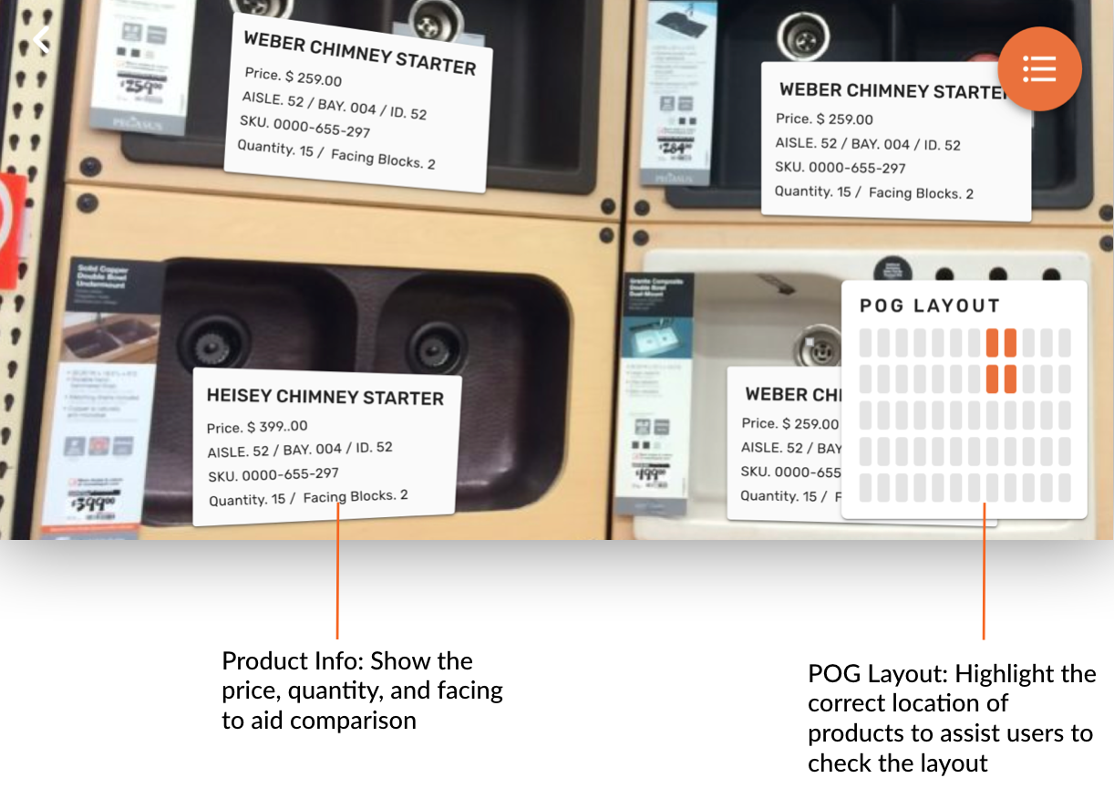 AR Planogram: Instead of using the paper planogram to check layout and prices, our system will scan all the product barcodes and provide this digital AR planogram to assist comparison and completion of bay tasks.
