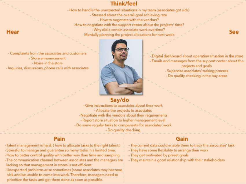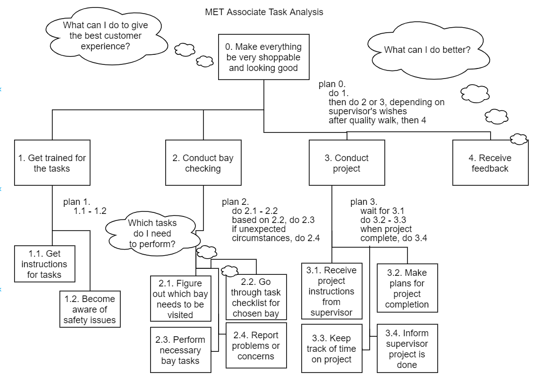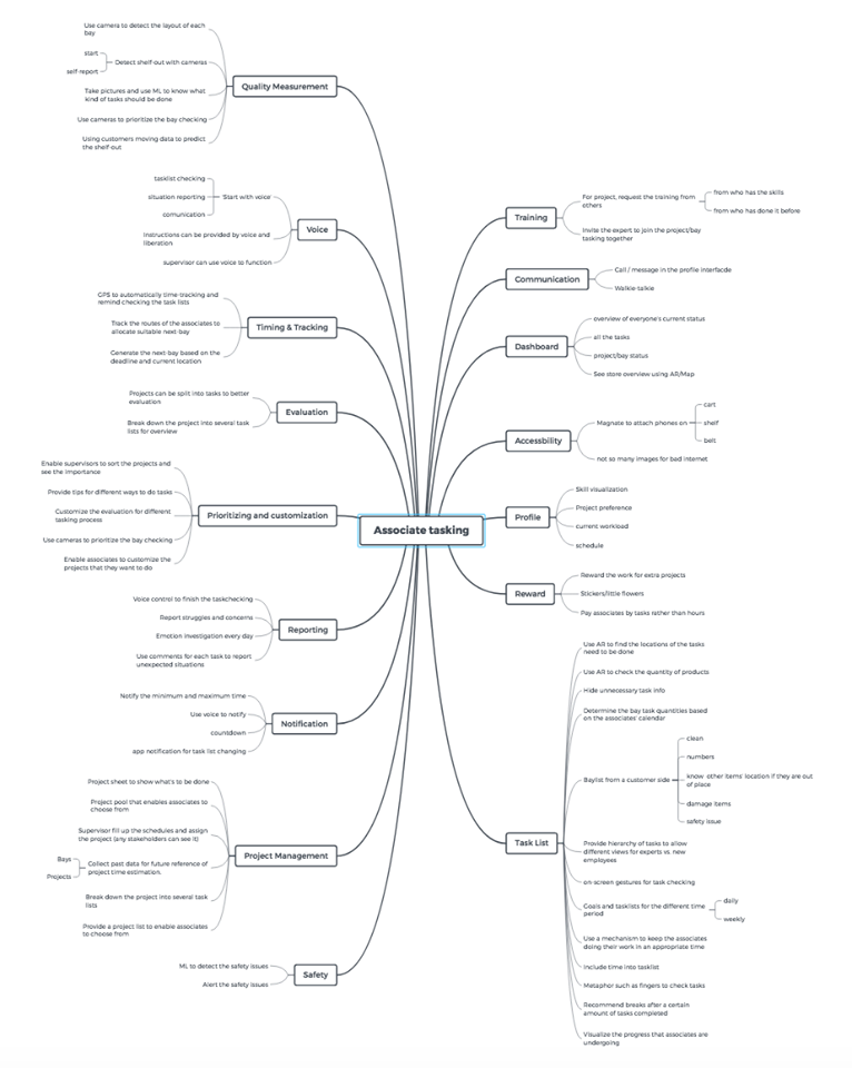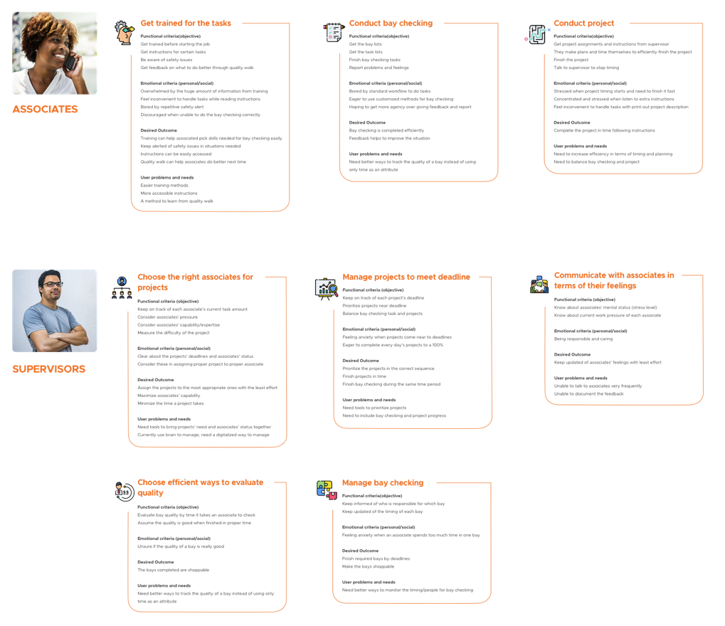 To ensure that our system would account for all the tasks that our users must complete, we did a breakdown of the task for both associates and supervisors through task analysis. This helped us get a sense of the work flow and all the main components that we would need to consider in our design.
