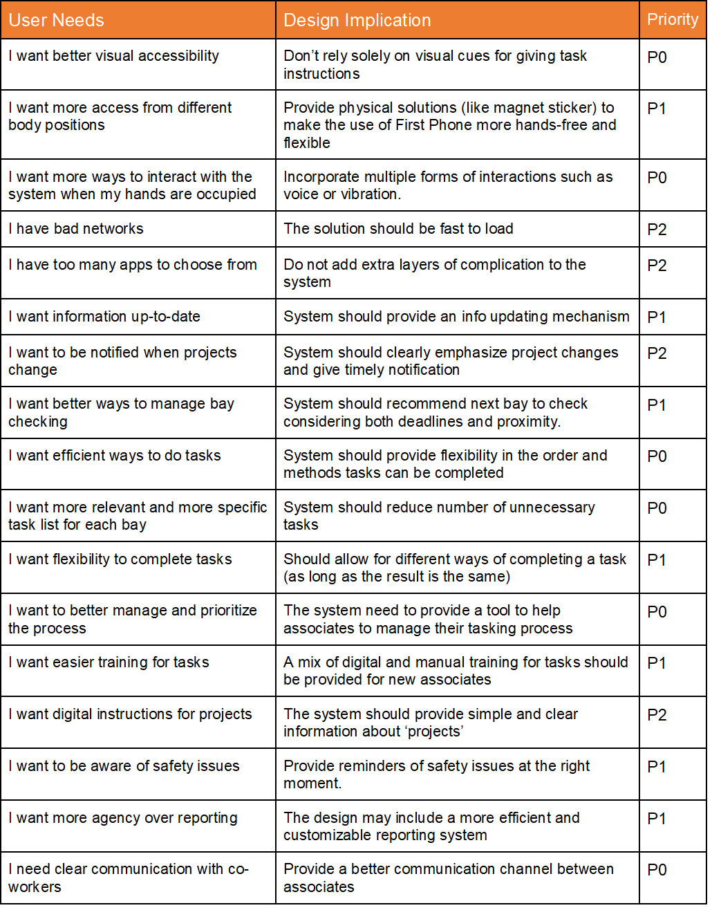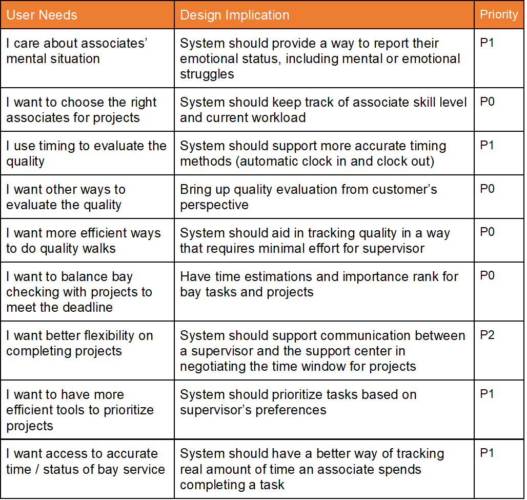 Taking all of the above findings into consideration, my group and I held a brainstorming session where we considered the design implications. Then we grouped our implications together based on common themes, then prioritized which implications were the most important to address in our design. The tables below show the results.