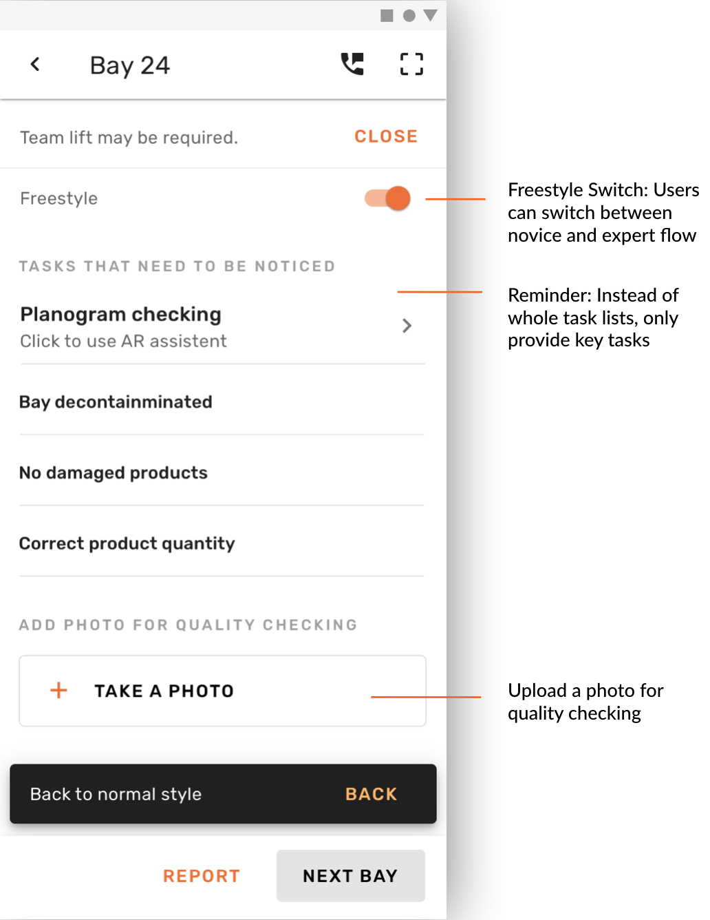 Expert Flow: Once an associate has gained enough experience, they can use the free-style method for checking tasks. This means that associates do not have to check tasks one by one. Instead, they will only be reminded of a few key tasks.