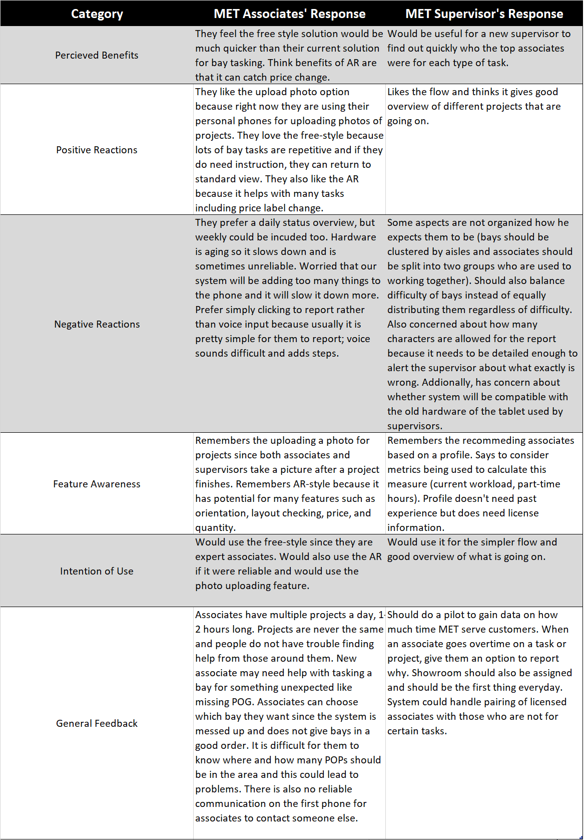 We recruited 2 associates and 1 supervisor in the second round. We asked them to think aloud as we went through the prototypes of the combined system (included free-style, AR, and voice features). The table below shows the synthesis of our findings from the second round of feedback.