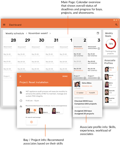 This tablet application gives a calendar overview for supervisors to better manage deadlines and associates. They can view detailed information, associate profiles (which shows their skills), and goals for the week. It also recommends which associates would be best for a certain task.